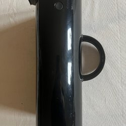 En retro termoskanna med svart handtag, lock och bas.