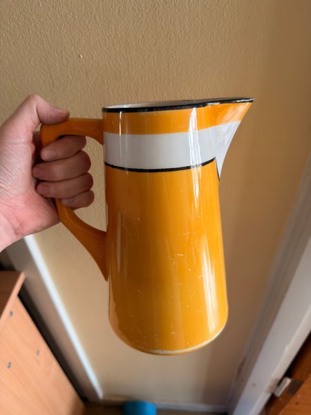 Gul vattenkanna med vitt band och svart kant. Handtag i samma gula färg.