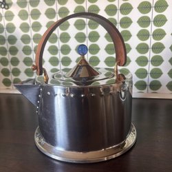 Tekanna från Bodum med löstagbar filterinsats och korkunderlägg. Filter insats i plast, gulnad med avslagen bit. Se sista bilden.