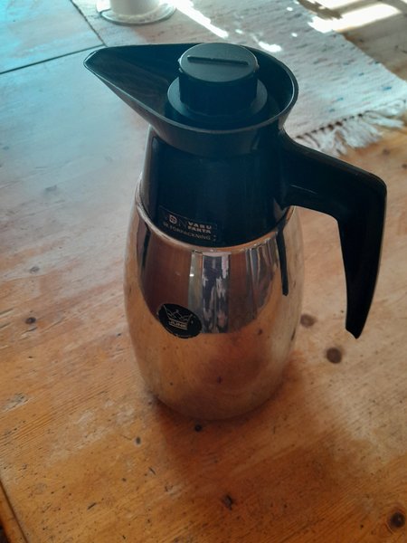 Termos i rostfritt stål med svart handtag och lock. Märkt "June" och "VARUFAKTA SE FÖRSPACKNING".