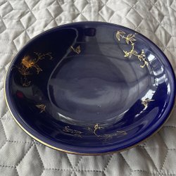 En blå skål. 15cm i diameter och 8cm hög. Passar även som ljushållare till kubbljus.