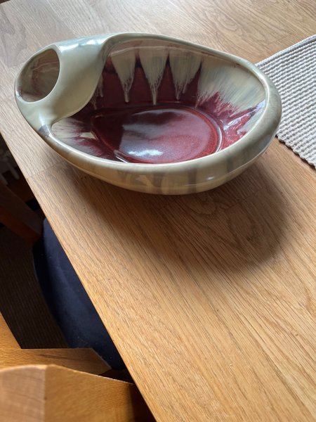 En keramikskål med en unik design. Skålen har en rödbrun insida med en vitaktig glasyr som rinner ner från kanten, vilket skapar ett intressant mönster. Utsidan är i en ljusare, neutral färg. Skålen har en oval form med en utskjutande del på ena sidan som kan fungera som ett handtag eller en dekorativ detalj.