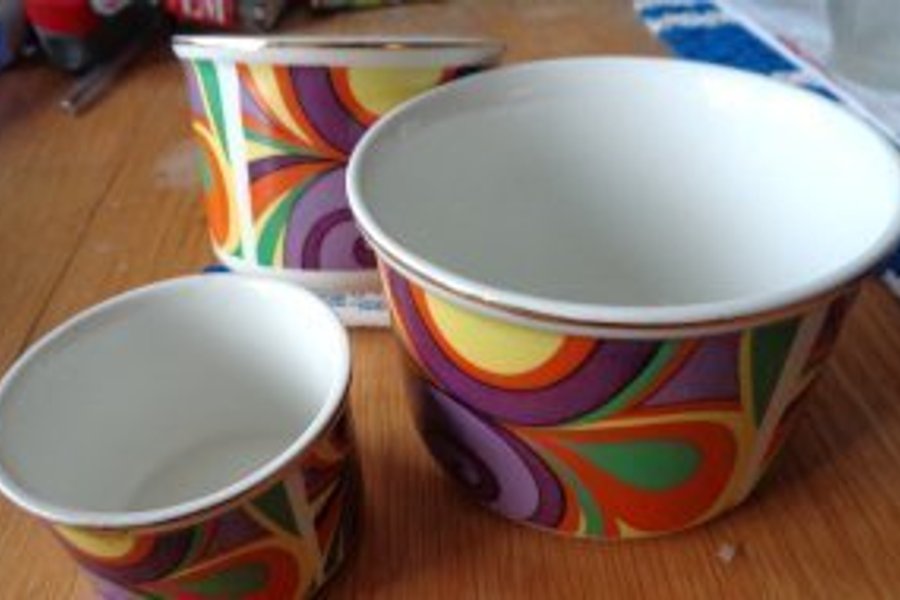 Set med tre skålar med ett färgglatt mönster. Från Enoch Wedgewood (Tunstall) GB. Storleken på skålarna är4,6 o 7 cm på höjden och 6,8 o 9 cm i diameter.