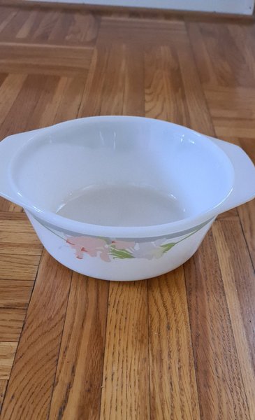 Serveringsskål eller karott i målat glas. Tryckt blomdekor på sidorna. 20 cm i diameter i överkant. Fint skick.