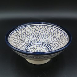En keramikskål i blått och grått. Skålen har en räfflad utsida och en slät insida. Botten är orangefärgad med ett mönster.