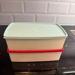 Två Tupperware förvaringsburkar med lock. 1st 500 ml, 1st 2,1 L använda men i fint skick.