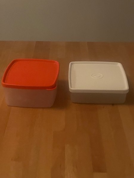 Två Tupperware lådor. En låda är vit med vitt lock och den andra är vit med orange lock.