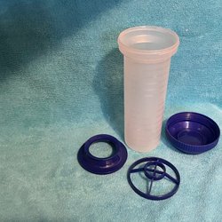 Vit praktisk Tupperware spagettibehållare med blå lock i båda ändarna. Doseringsmått i ena ändan