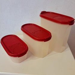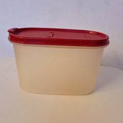Tupperware burk med rött lock. Burkens volym är 500 ml.