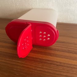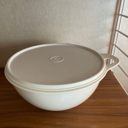 En Tupperware burk med tillhörande lock. Burken är vit och har en enkel design.
