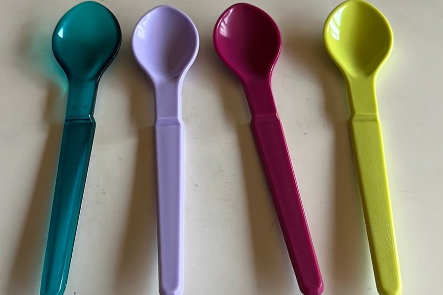 Tupperware Nya Set med fyra skedar i olika färger: turkos, lila, fuchsia och limegrön. Jag skickar i slutet på veckan