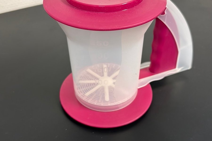 Mjölsikt från Tupperware i plast. Färgen är vit och mörkrosa. Den har ett handtag och en bas.