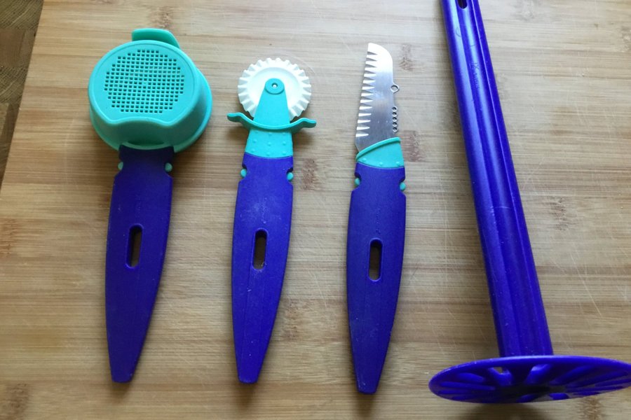 Set med Tupperware köksredskap. Innehåller en sikt, en degsporre, en kniv och en potatisstöt.