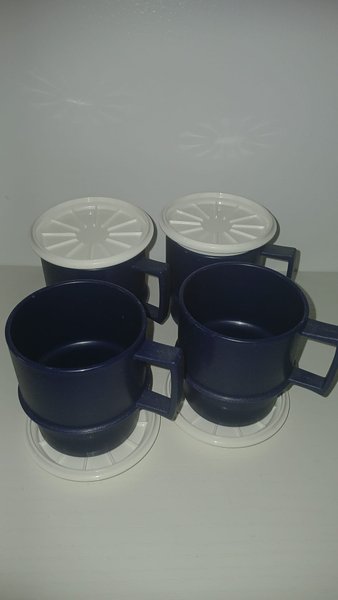 Set med 4 mörkblå muggar. Varje mugg har ett vitt lock. Multimuggar från tupperware