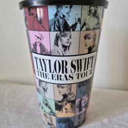 En vit och blå Tupperware vattenflaska med drickpip. Det är plats för en liten förvaring i den blå bottnen. Perfekt att ta med till badhus/stranden/utflykt. Helt ny och oanvänd.