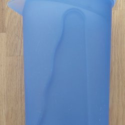 En Tupperware kanna i turkos färg. Kannan har ett handtag och ett avtagbart lock. 2,1 liter.