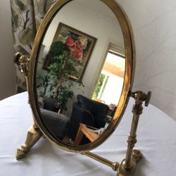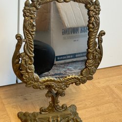 En stilig bordspegel med en rund design och metallram. Perfekt för sminkning eller som en dekorativ detalj i hemmet.