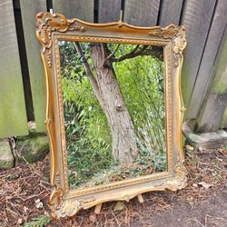 En charmig antik spegel med en vacker träram. Perfekt som en dekorativ detalj i hemmet.