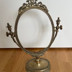 Charmig bordsspegel i gjuten metall med mässingsfärgad patina.