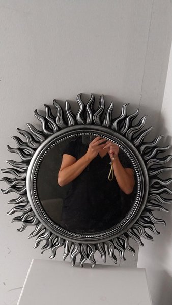 Dekorativ spegel med en ram formad som solstrålar. Ramen är silverfärgad med svarta detaljer som ger ett djup till designen. Spegeln har en rund form och är omgiven av små pärldekorationer längs kanten.