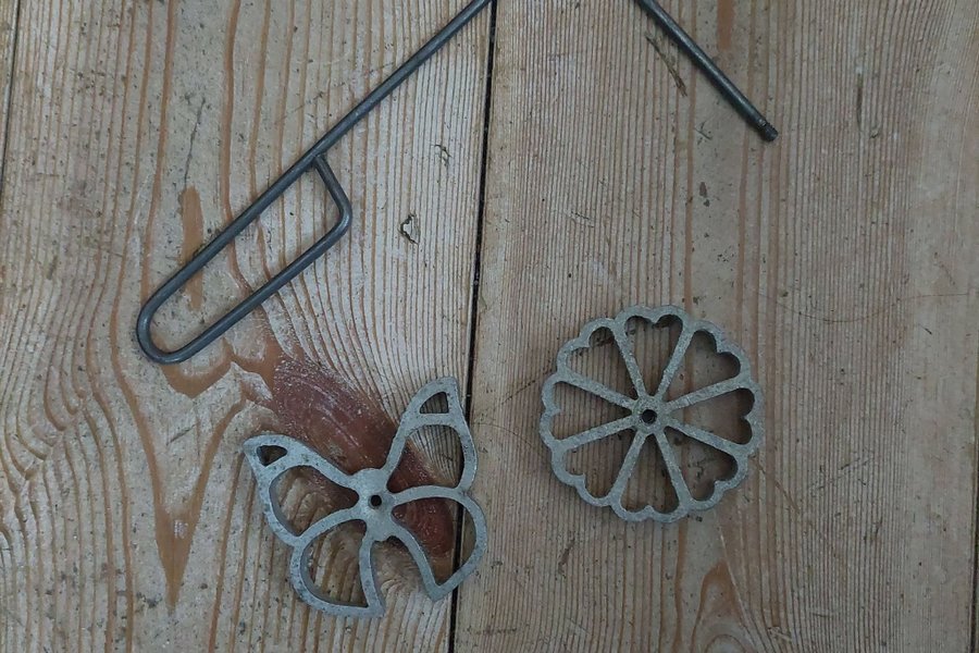 Struvjärn med två olika formar. En form är fjärilsformad och den andra är blomformad.