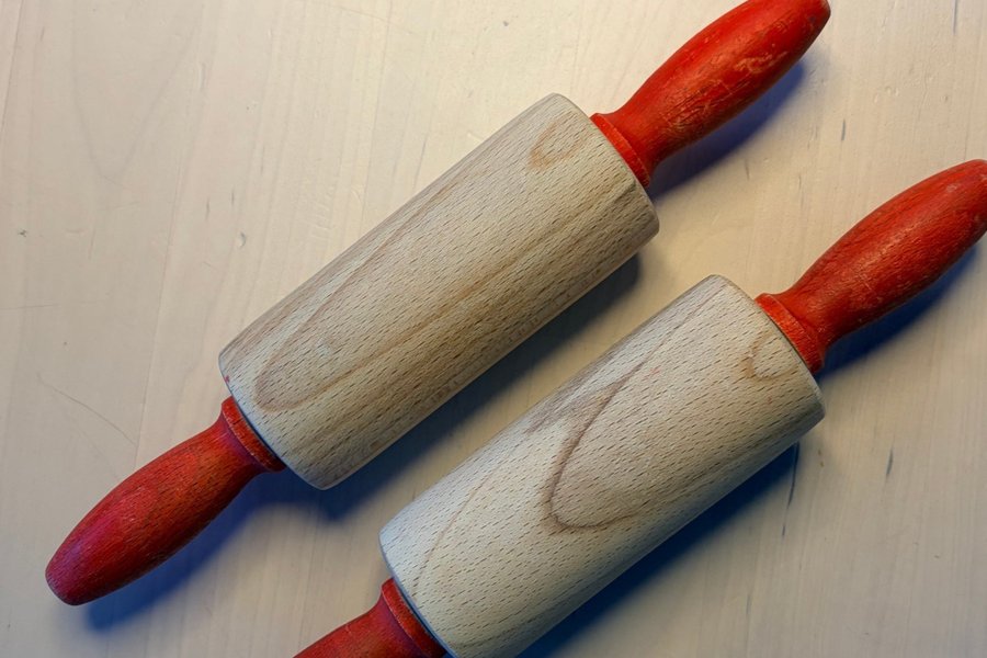 2 st kavlar för barn i trä. Tecken på användning finns men har många fler pepparkakor att göra!