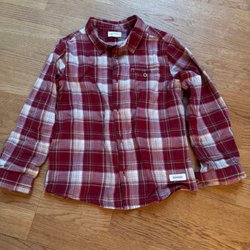 En rutig skjorta i blått/brun/vitt med knappar framtill och en ficka på bröstet. Använd 1gång, så utan anmärkning.