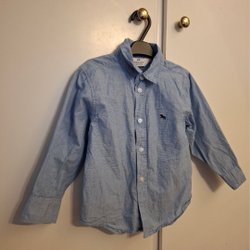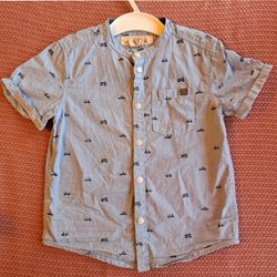 Ljusblå skjorta med långa ärmar och ett tryck av små bilar i olika färger. Skjortan har en klassisk krage och knäpps framtill med vita knappar.