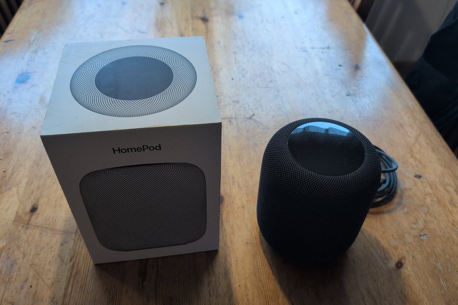 Första generationens Homepod med orginalemballage i grått.