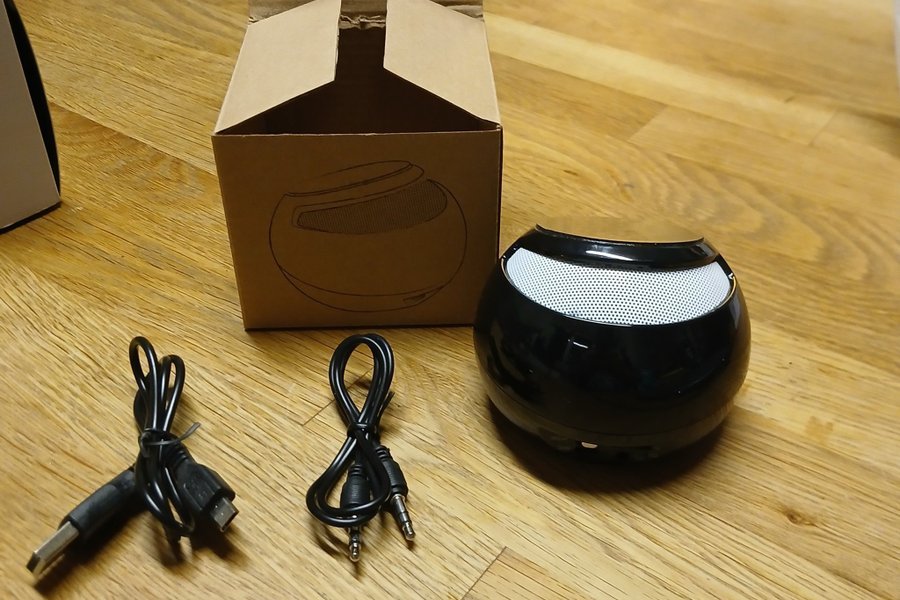 Bärbar högtalare i svart färg. Högtalaren är rundad med ett vitt galler. Den levereras med en USB-kabel och en 3.5mm ljudkabel.