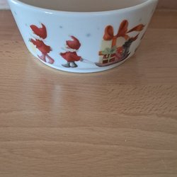 Maskeradmask i form av ett lurvigt djurhuvud. Masken är vit och ljusblå med rosa insida på öronen. Ögonen är stora och blå med en hjärtformad pupill. Skada på ett öga enligt bild Masken har långa, hängande "armar" i ljusblått tyg.