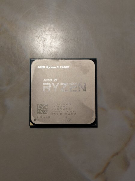 AMD Ryzen 5 2400G processor. Modellnummer: YD2400C5M4MFB AN 1846PGS 9HG5478W80336 Diffused in USA, Made in Malaysia © 2016 AMD