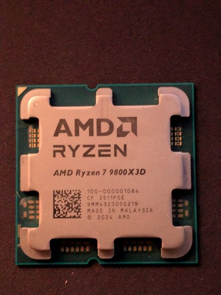 AMD Ryzen 7 9800X3D processor. Modelnummer 100-000001084, CF 2511PGE. Fremstillet i Malaysia i 2024.