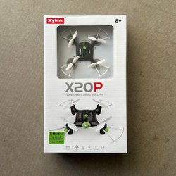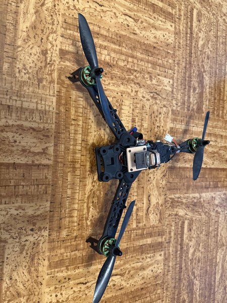 Drönare med fyra propellrar och motorer. Ramen är svart och propellrarna är svarta. En GPS-modul är monterad på drönaren.
