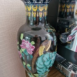 En vacker tavla med abstrakt motiv i blåa och rosa toner med gulddetaljer. Begagnad bra skick, längd 52cm