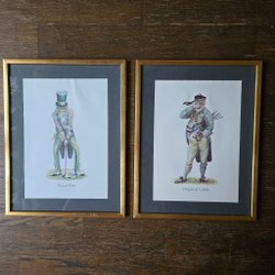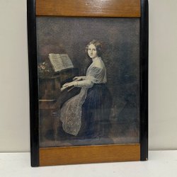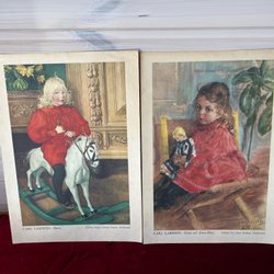 Ett tryck med motiv av två flickor med blommor. På baksidan finns bilder av olika figurer.