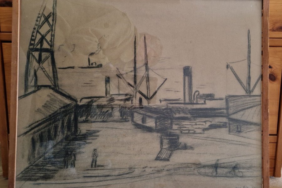 Tror det är en kolteckning. Göteborgs hamn med packhus till vänster.