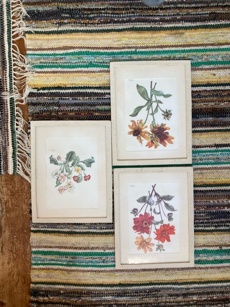Tre tavlor med blommiga motiv. Motiven föreställer olika blomsterarrangemang i färg. Tavlorna har en ljus ram. Ina wallreiser