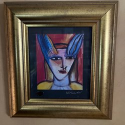 En vacker tavla med motiv av en pojke och en fågel. Signerad Sara Fathi -61. Etikett på baksidan från Ramaffären Merkur.