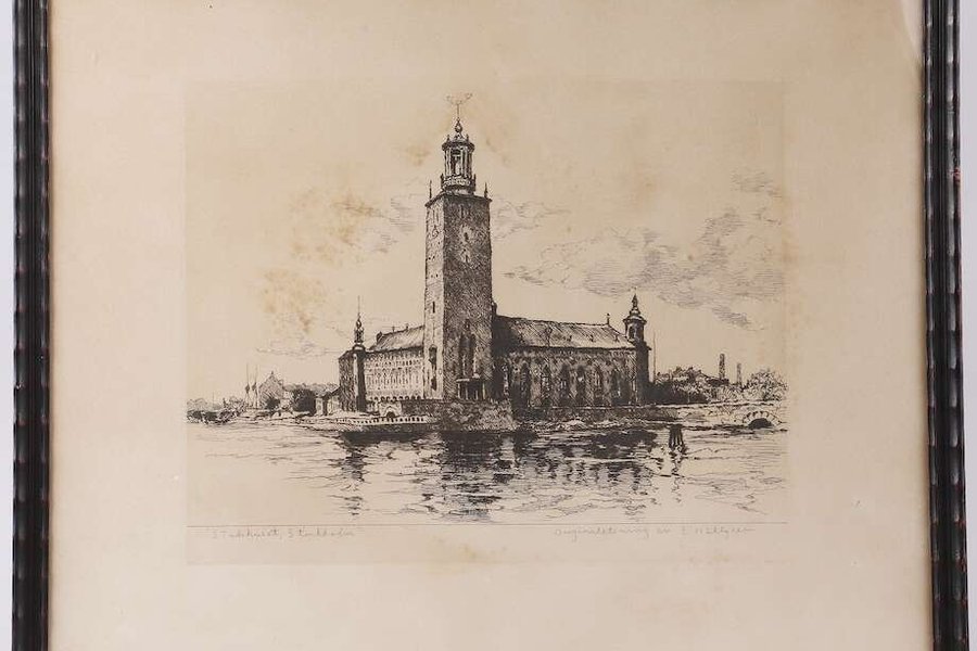 . Bilden visar byggnaden från vattnet med dess karaktäristiska torn och fasad. Vattenytan reflekterar byggnaden och himlen.Ernst Hällgren, etsning, 31 x 39