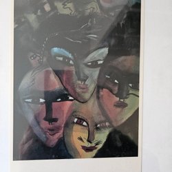 Konsttryck med motiv av en kvinna med krona och två mindre ansikten. Trycket har en matt yta och är monterat på en träfiberskiva. Mått : 15 × 30 cm