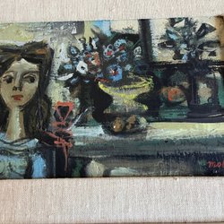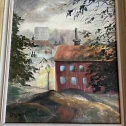 Tre tavlor av Ripa. En tavla föreställer ett hamnlandskap med båtar och kranar. En annan tavla visar ett vinterlandskap med träd och byggnader. Den tredje tavlan avbildar en stadsmiljö med en byggnad som har ett torn och en klocka.