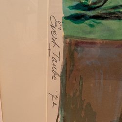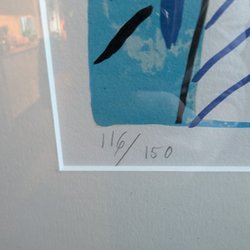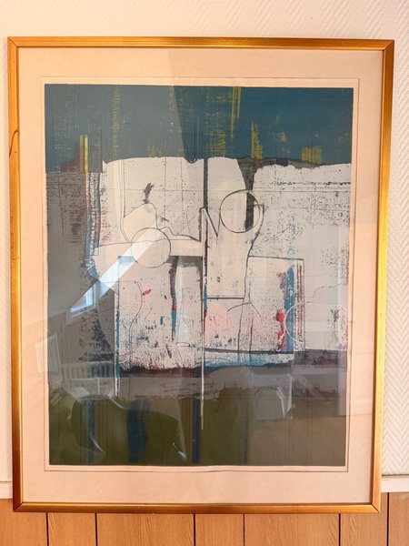 Litografi med abstrakt motiv i blå, vita och gula toner. Verket är signerat och numrerat.