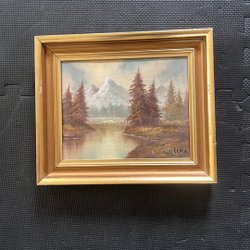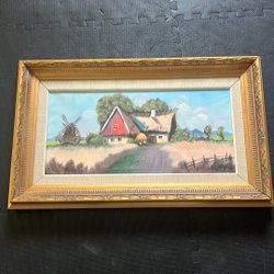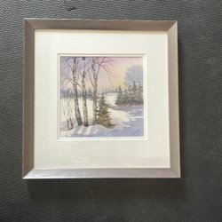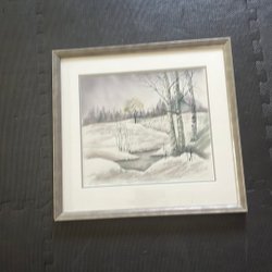 Målad tavla med motiv av en familj. Färgerna är dova och bilden föreställer fyra personer i vad som ser ut att vara ett vinterlandskap. Tavlan är inramad.