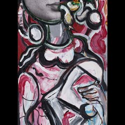 En stor tavla är signerad i nedre vänstra hörnet. Konstverket har en abstrakt stil med mörka toner och inslag av ljusare färger. Tavlan är ca:133x93 ramen är lite ful se bilder. Köpt på Uppsala auktionskammare för några år sen.