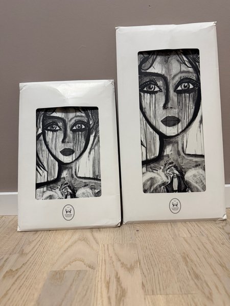 Två tavlor från Gynning Design. Motivet är en kvinna i svartvitt med rinnande tårar och en mindre figur vid bröstet. Tavlorna är i olika storlekar.