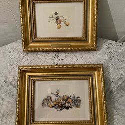 Två abstrakta tavlor med färgerna vit, svart, lila och guld.