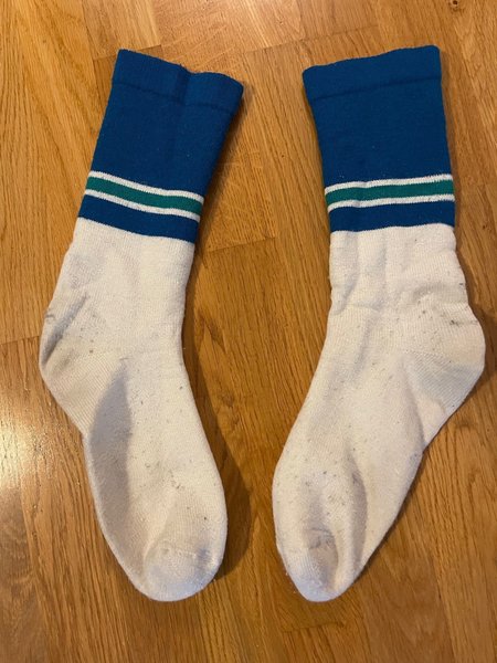 Ett par tjocka vita strumpor med blått och grön-vit randigt mönster upptill.