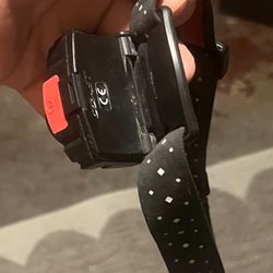 Pannlampa med elastiskt band. Lampan är blå och grön med ett gult elastiskt band. Den väger 80 gram. En defekt finns där man stänger för batteri så man behöver ha en liten tejp för att hålla på plats. Funkar som den ska i övrigt