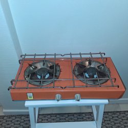 Campingkök med tre utfällbara stödarmar och en blå gasreglage. Köket är kompakt och lätt att transportera. Det är utformat för att användas med gasbehållare och har en robust konstruktion för utomhusbruk. Campingkök